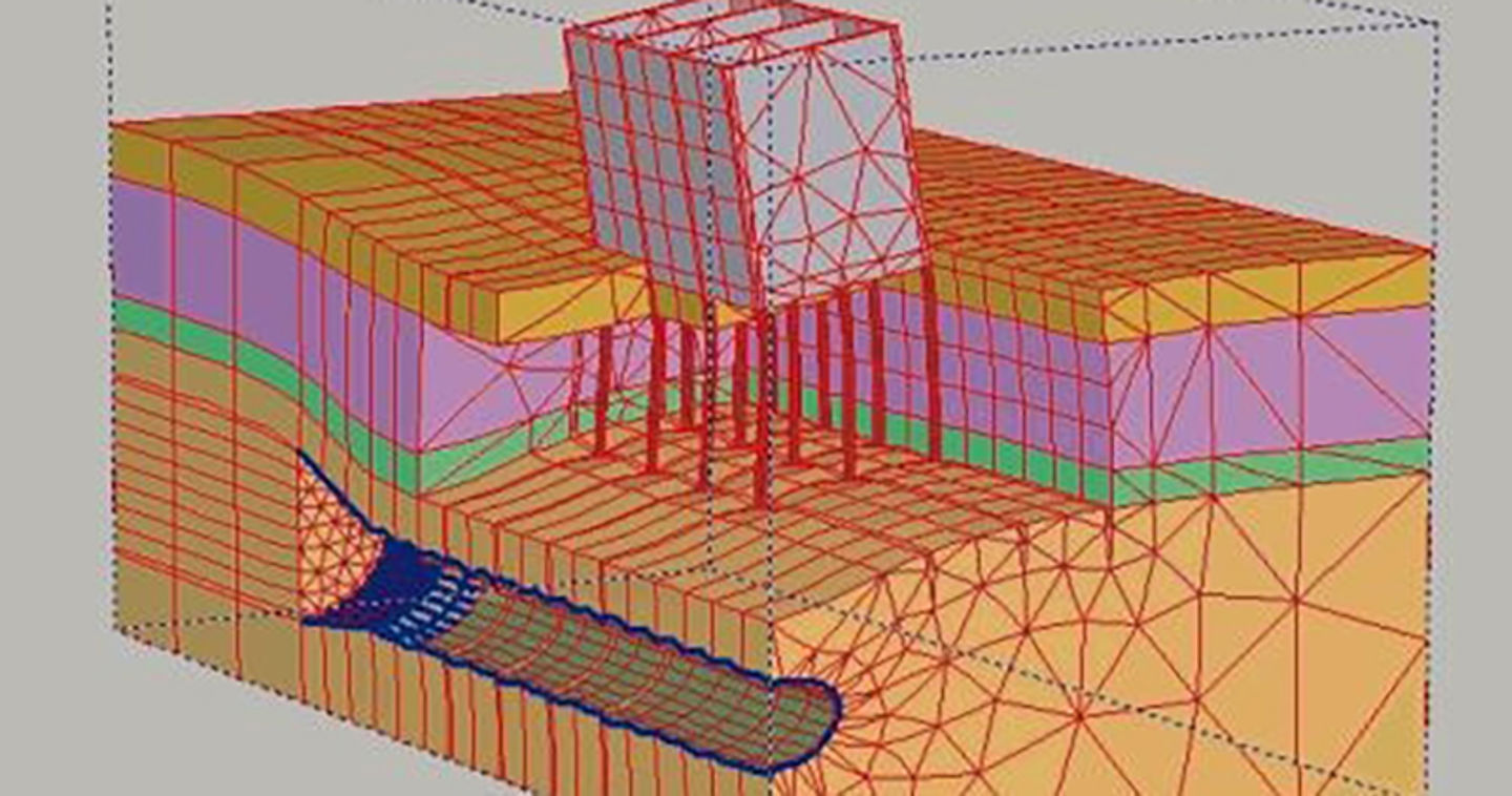 NGI benytter blant annet elementmetoden (FEM – finite element method) til å simulere oppførsel av fundamenter for store konstruksjoner. Vi har også utviklet egne programmer skreddersydd for dynamisk oppførsel av fundamenter, og kapasitet av sugeankre og skjørtefundamenter i leire og sand.