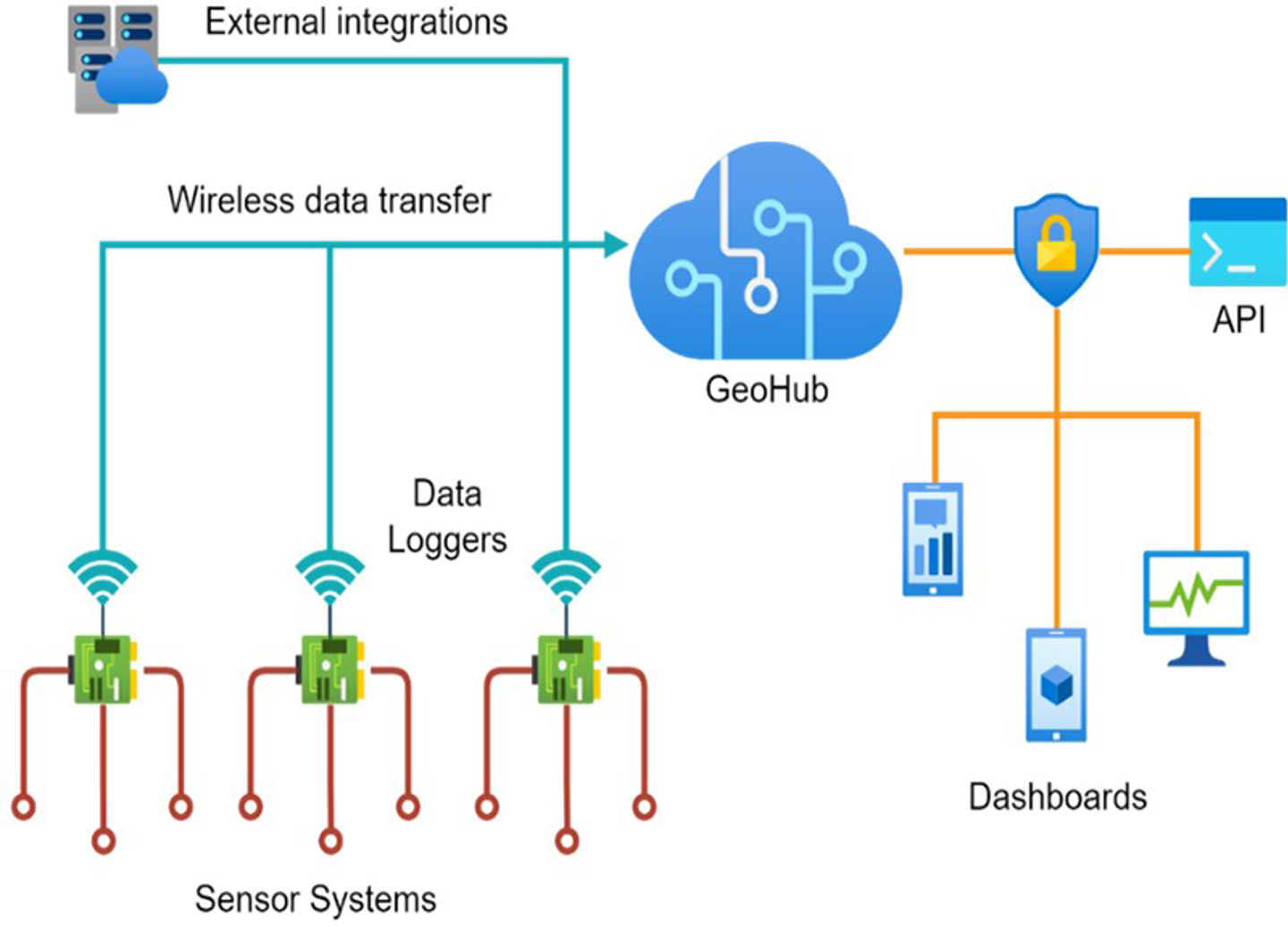 Målesystemene er typisk koblet til lokale dataloggere som overfører data trådløst (via IoT-modem, radio, 4G eller Wifi) eller via fiberkabel til vår skybaserte løsning (NGI GeoCloud), med presentasjon av data tilgjengelig via vår webbaserte plattform "NGI Live".