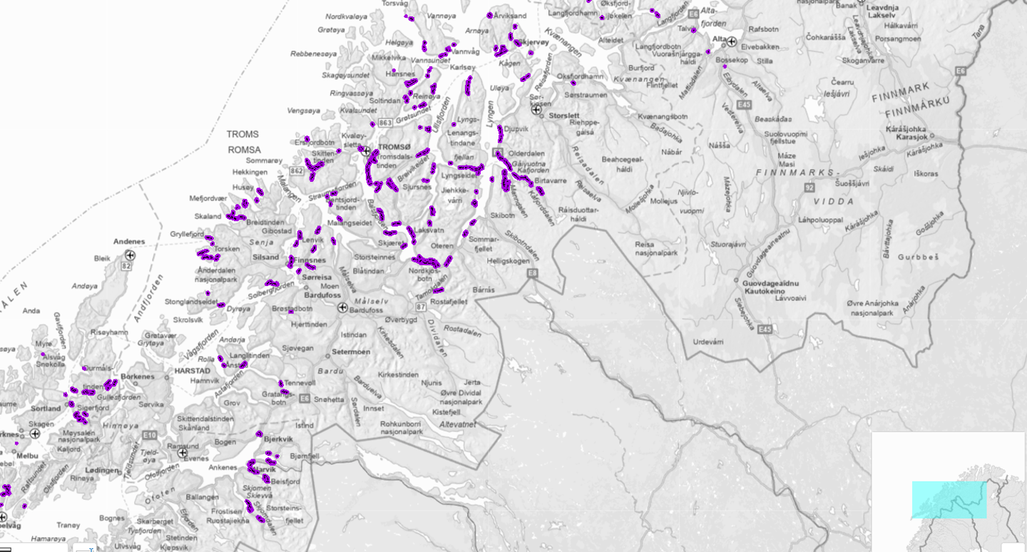 De NAKSIN-baserte aktsomhetskartene for snøskred som gjelder for bebyggelse er tilgjengelige via NVEs Atlas. Utsnittet over, fra Troms fylke, er hentet fra NVEs Atlas. De lilla områdene viser faresone for skred.