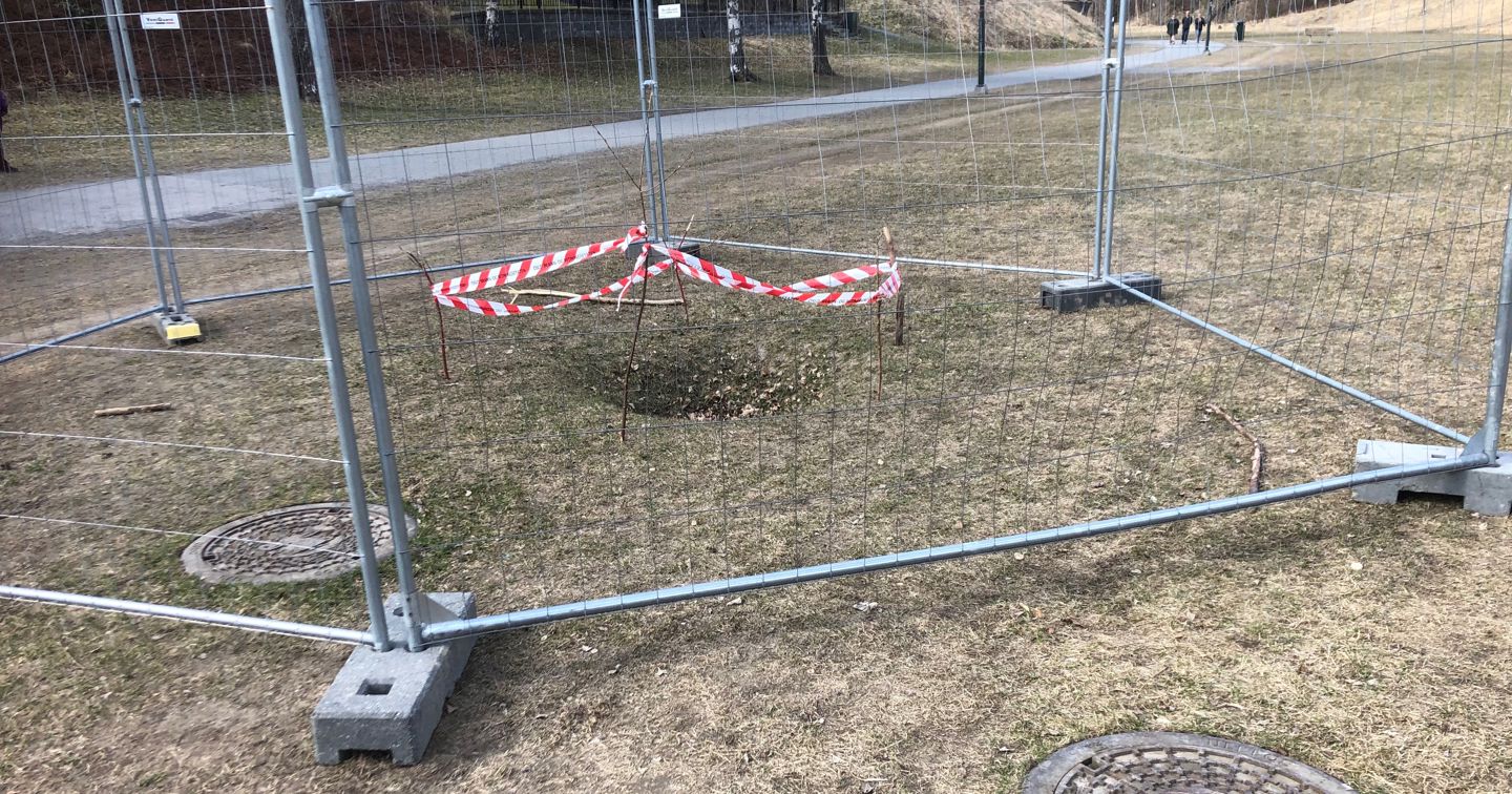 Et synkehull i Hovseterdalen i Oslo i 2021. Hullet oppsto trolig som følge av rør eller ledninger i bakken som har forårsaket erosjon i massene under overflaten. Området ble sperret av fordi hullet var stort nok til at man kunne falt ned i det. ( Foto: Håkon Heyerdahl / NGI)