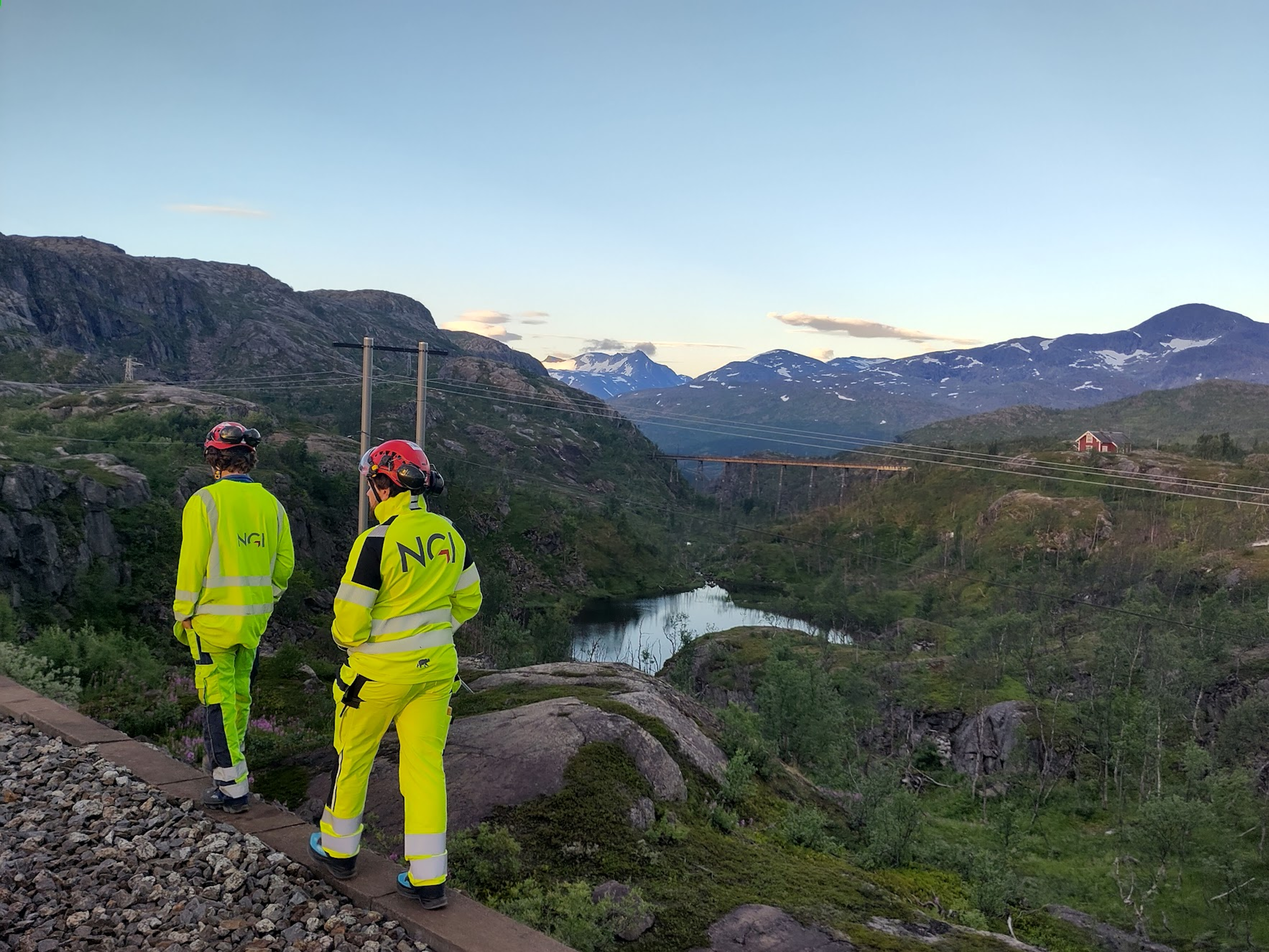 NGI-ingeniører på befaring ved Søsterbekk på Ofotbanen. I dette avsidesliggende fjellandskapet nær svenskegrensen installeres et avansert sensorsystem for å overvåke jernbanebruene i sanntid. ( Foto: Bane NOR)