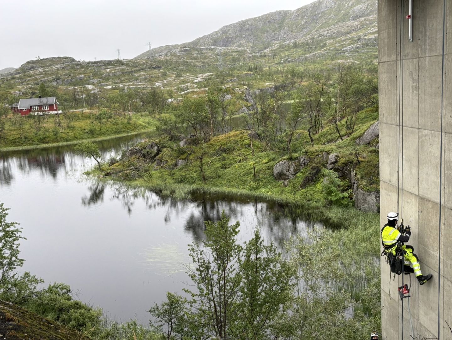 Tauarbeid er nødvendig for å komme til på undersiden av bruene ved Søsterbekk. Terrenget er for bratt til å bruke stillas, og mye av instrumenteringen må installeres fra tau. ( Foto: Bane NOR)