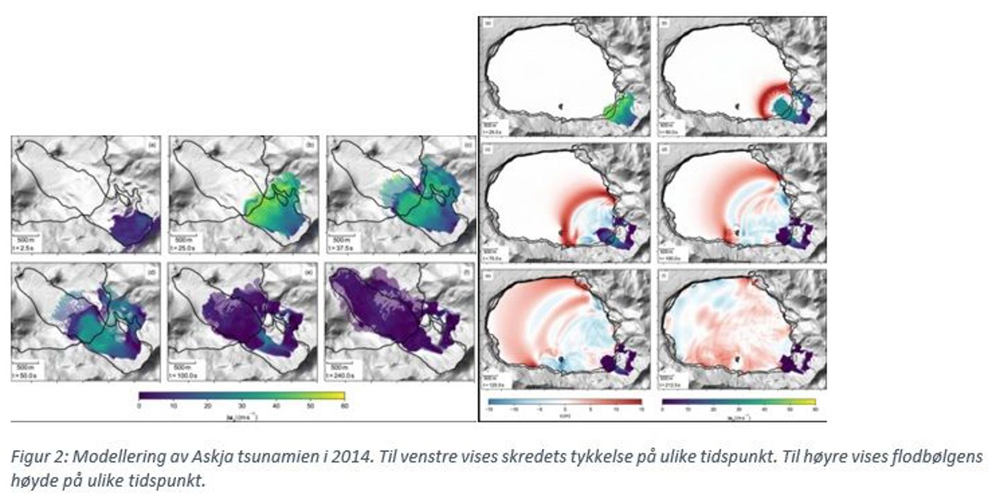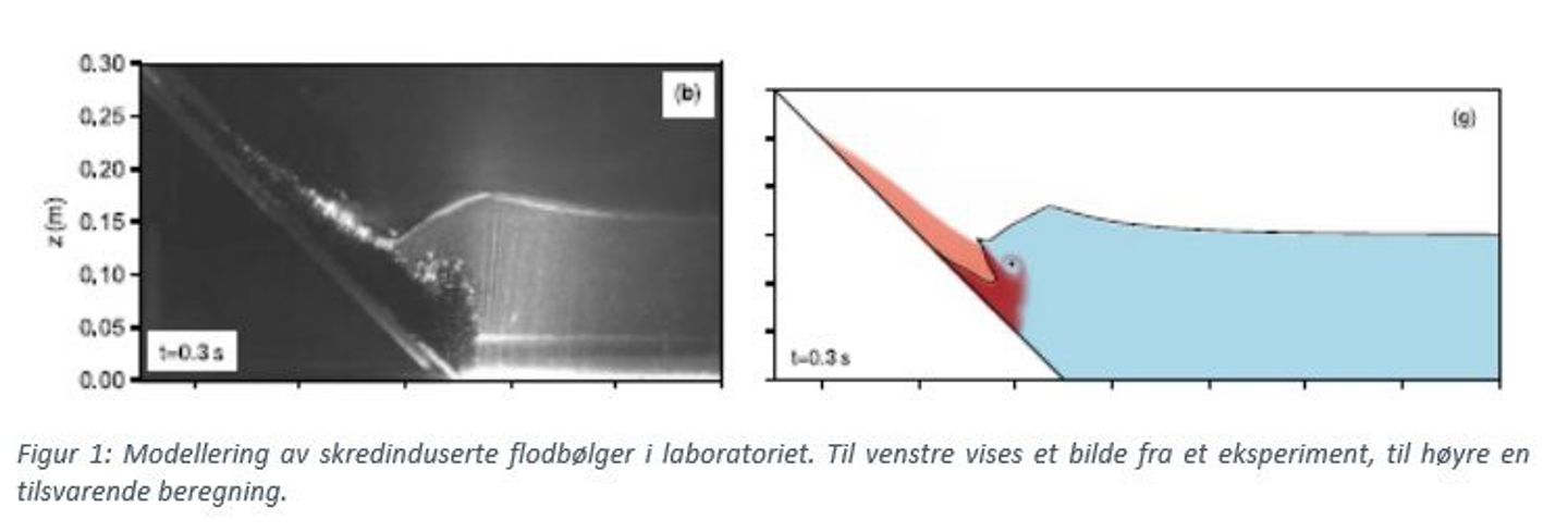 I artikkelen presenterer vi for første gang en modell som på en konsistent måte kan brukes til å beregne flodbølger på ulik skala. Fra småskala eksperimenter til en virkelig 80 meter høy tsunami som fant sted på Island i 2014 (Lake Askja). Figurene viser at modellen beskriver både skredet og bølgen godt. Til forskjell fra tidligere modeller er beregningene gjennomført helt uten tilpasning og kalibrering. Tidligere modeller har dessuten ikke klart å både beregne bølgen og skredet i samme modell.
