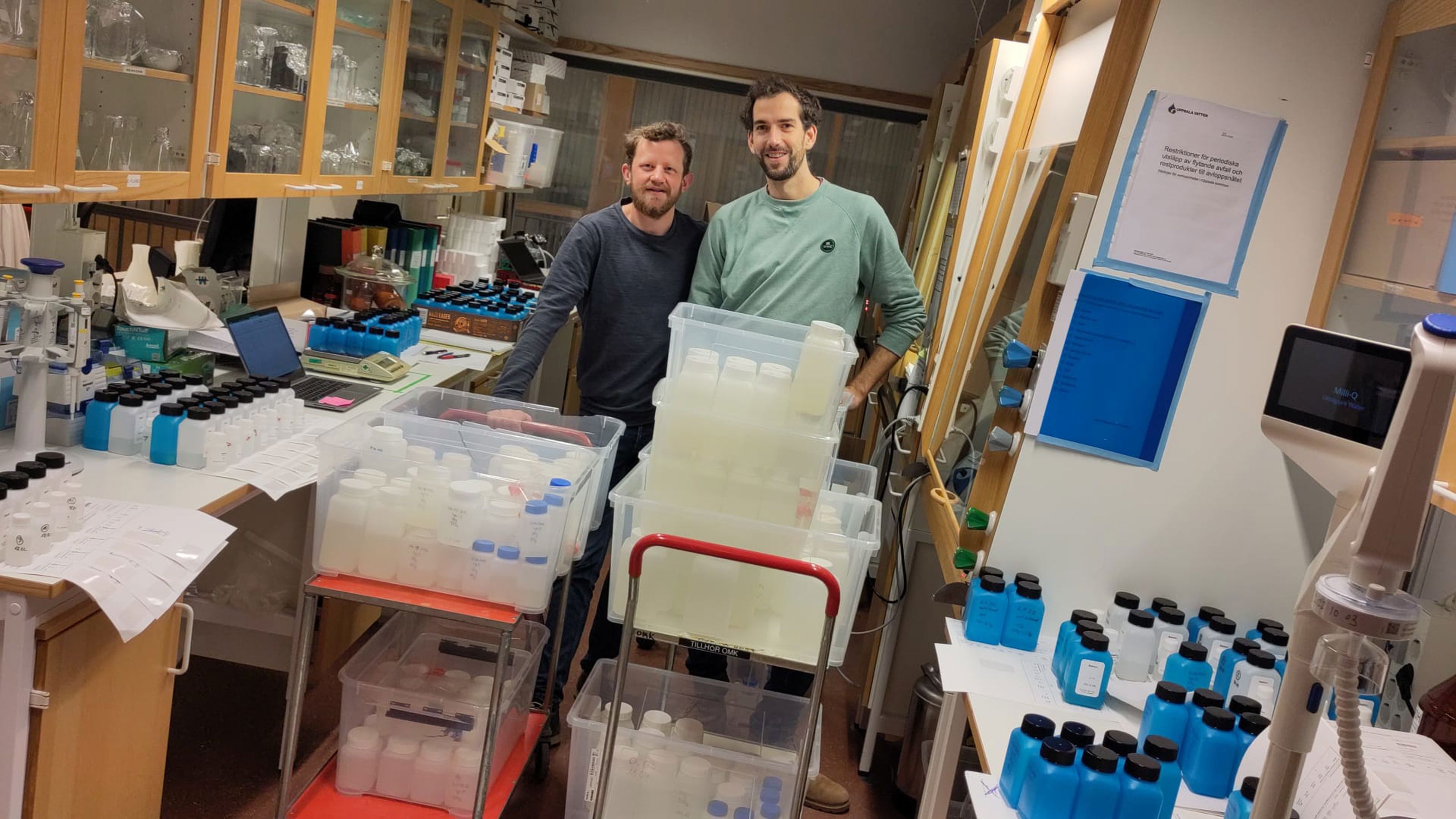 Michel Hubert fra NGI (til høyre) og Björn Bonnet fra Sveriges lantbruksuniversitet (SLU) analyserer jord- og vannprøver for PFAS i laboratoriet. Forskerne samarbeidet i et EU-finansiert prosjekt der biokull ble testet i felt over ett år. ( NGI)