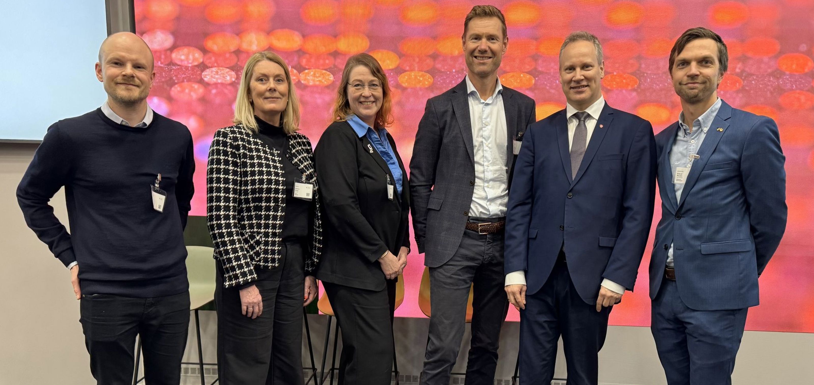 Senterledere og politikere samlet under lanseringen av Transport 2050 i Samferdselsdepartementet. Fra venstre: Askill Harkjerr Halse (senterleder TRANSPLAN, TØI), Marianne Ryghaug (senterleder TRACE, SINTEF), Siri Hunnes Blakstad, konserndirektør i SINTEF Community, Lars Andresen (administrerende direktør, NGI), Samferdselsminister Jon-Ivar Nygård og Erlend Risdal Moster (senterleder ResiTrans, NGI). ( Foto: Samferdselsdepartementet)