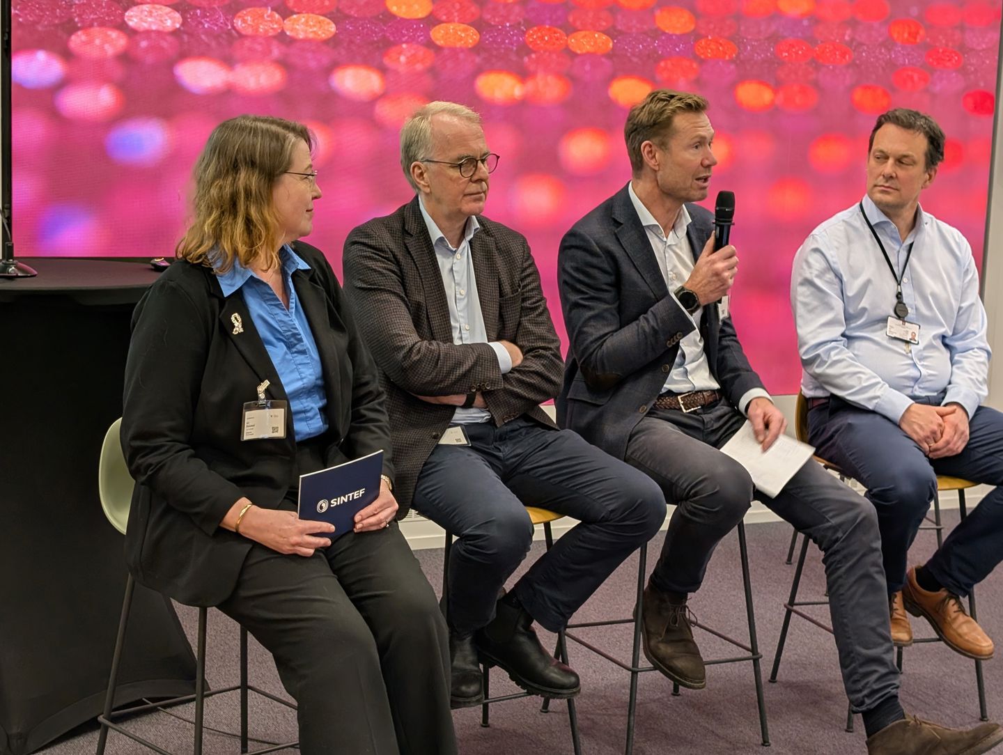 Debatt om Transport 2050 under landseringsseminaret i Samferdselsdepartementet. Fra venstre: Siri Hunnes Blakstad (SINTEF), Bjørne Grimsrud (Transportøkonomisk institutt), Lars Andresen (NGI) og Are Forbord (Samferdselsdepartementet) ( Foto: Per Olav Solberg / NGI)
