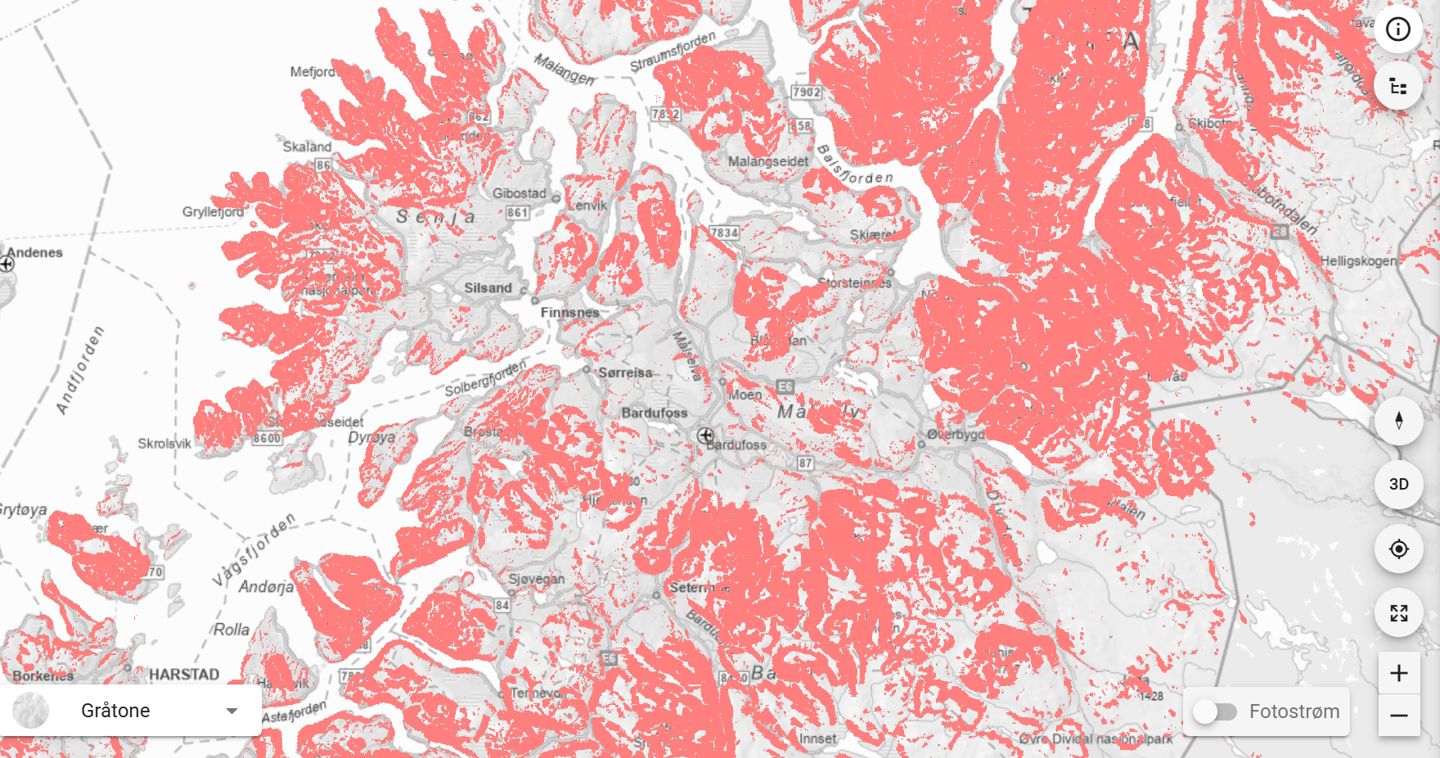 The NAKSIN-based susceptibility maps for snow avalanches are available via NVE. The red areas show potentially avalanche-prone areas as of 12 March 2026