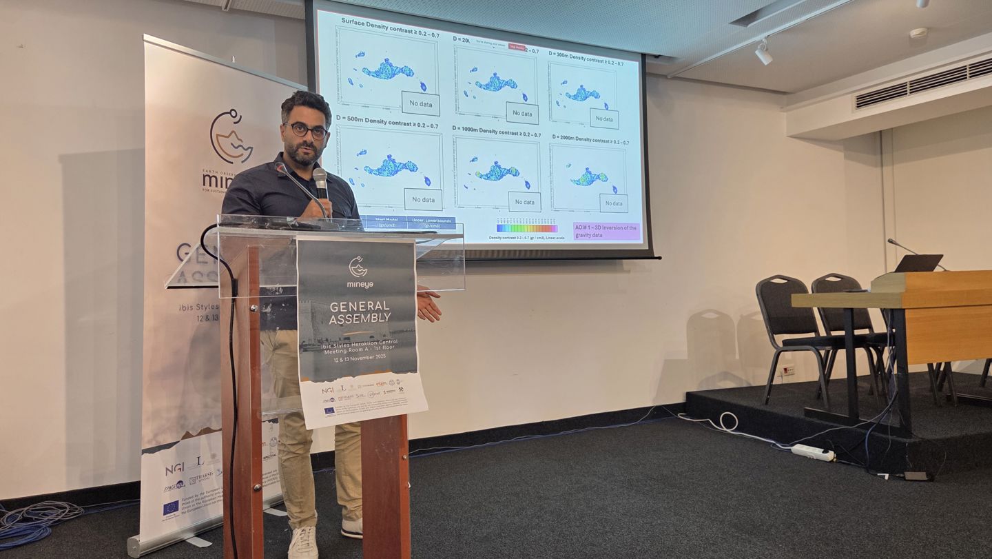 Saman Tavakoli, Scientific Coordinator of the MINEYE project and lead geophysicist at NGI, presents project progress during the MINEYE General Assembly in Crete. ( NGI)