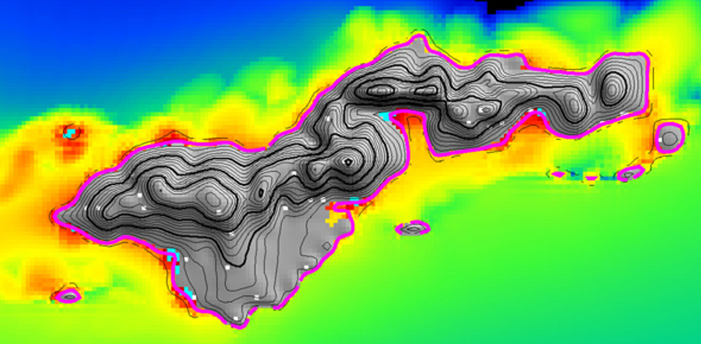 The computational grid for the run-up calculations is resampled down to a resolution of 200 meters. The calculations are therefore only valid as an overview over the run-up distribution since local effects are not captured in the coarse bathymetry.