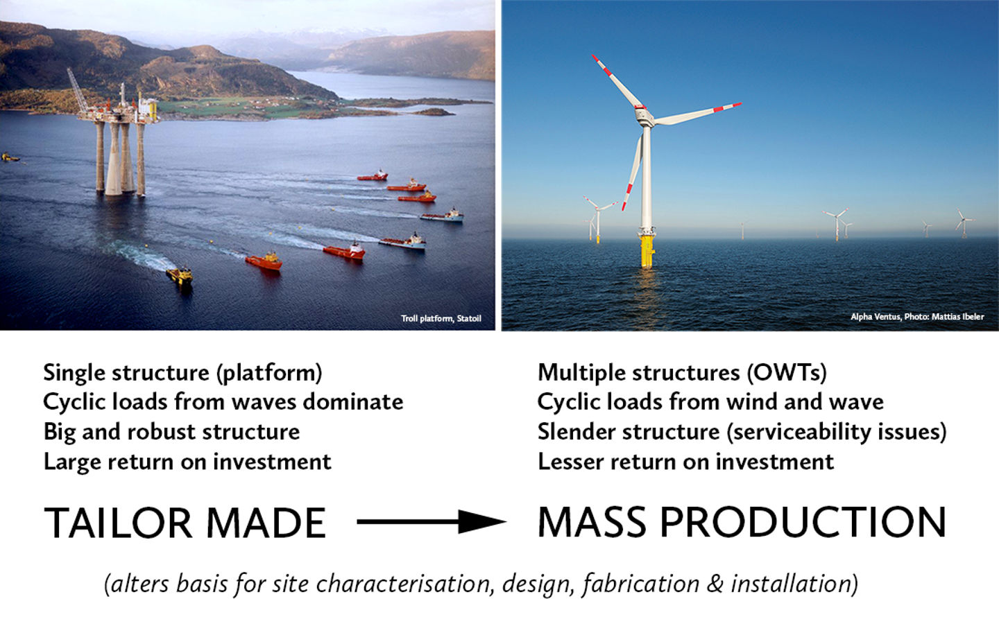 NGI’s approach to this research programme is based on over 40 years’ experience with foundations for offshore structures. In this respect, it is important to note that the change in focus from the design and construction of a foundation for a single, large offshore structure, such as an oil and gas platform, to the foundations for an offshore wind farm, is much like the shift from bespoke, or tailor-made engineering, towards mass production.