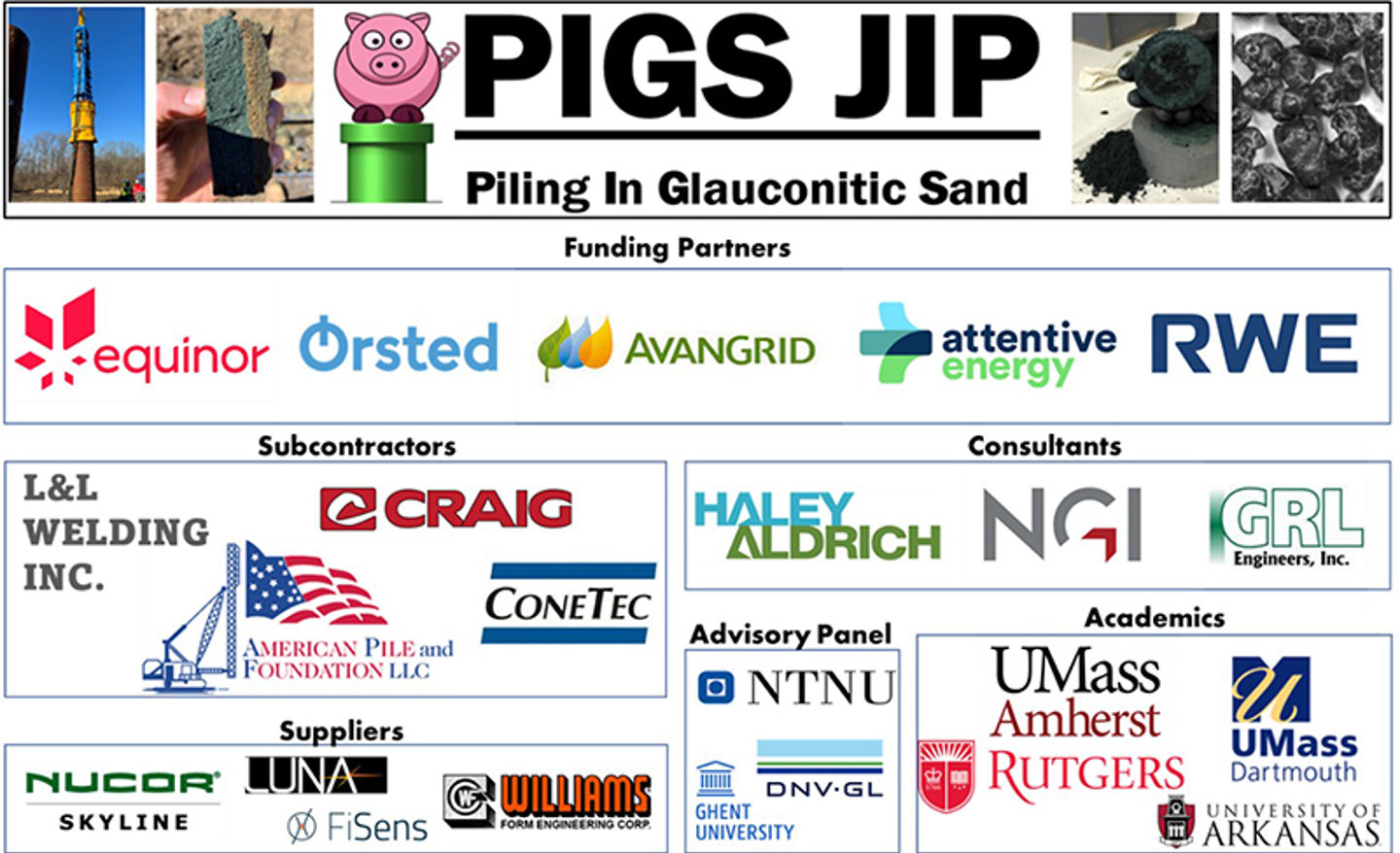 PIGS was established in August 2021 to conduct site investigation, field-scale pile testing, and data interpretation related to pile drivability and static vertical and lateral load testing. The main goal of the JIP is to develop an understanding of glauconitic soil behavior related to site characterization and soil-structure interaction to develop a framework for assessing the impact of glauconite on offshore wind infrastructure development, with a particular focus on the US Atlantic OCS and pile foundations.