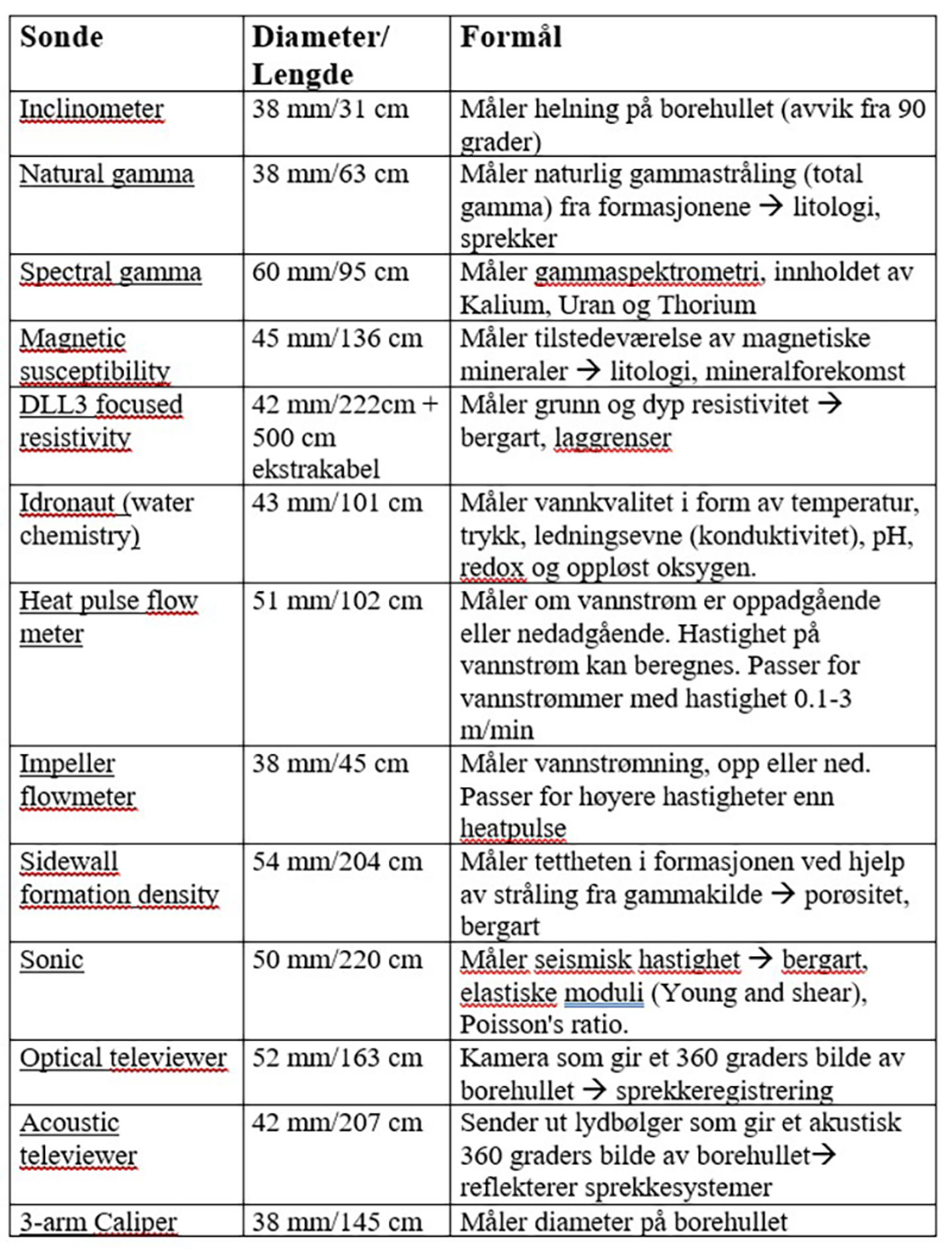 NGI har utstyr fra Geovista Ltd., inkludert vinsj og loggeenhet. En oversikt over sondene NGI har og hva disse kan brukes til er gitt i tabell nedenfor.