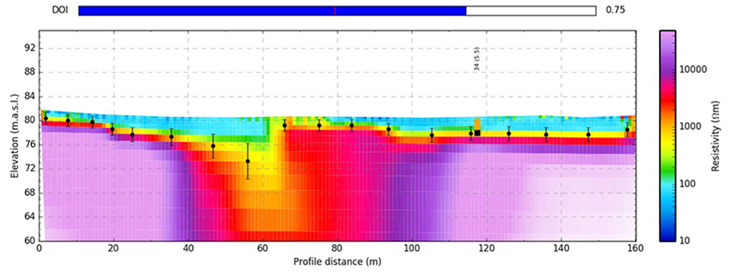 Eksempel på ERT-målinger fra et jorde på Ringerike og totalsonderinger utført i nærheten av profilet. Med kun to-tre boringer kan man velge en terskelverdi for f.eks. bergflaten og tolke denne (svarte punkter). Målingene gir også kontinuerlig informasjon i berget, og man ser tydelig trappetrinnsformasjonen fra de lagdelte kambro-silur-bergartene.