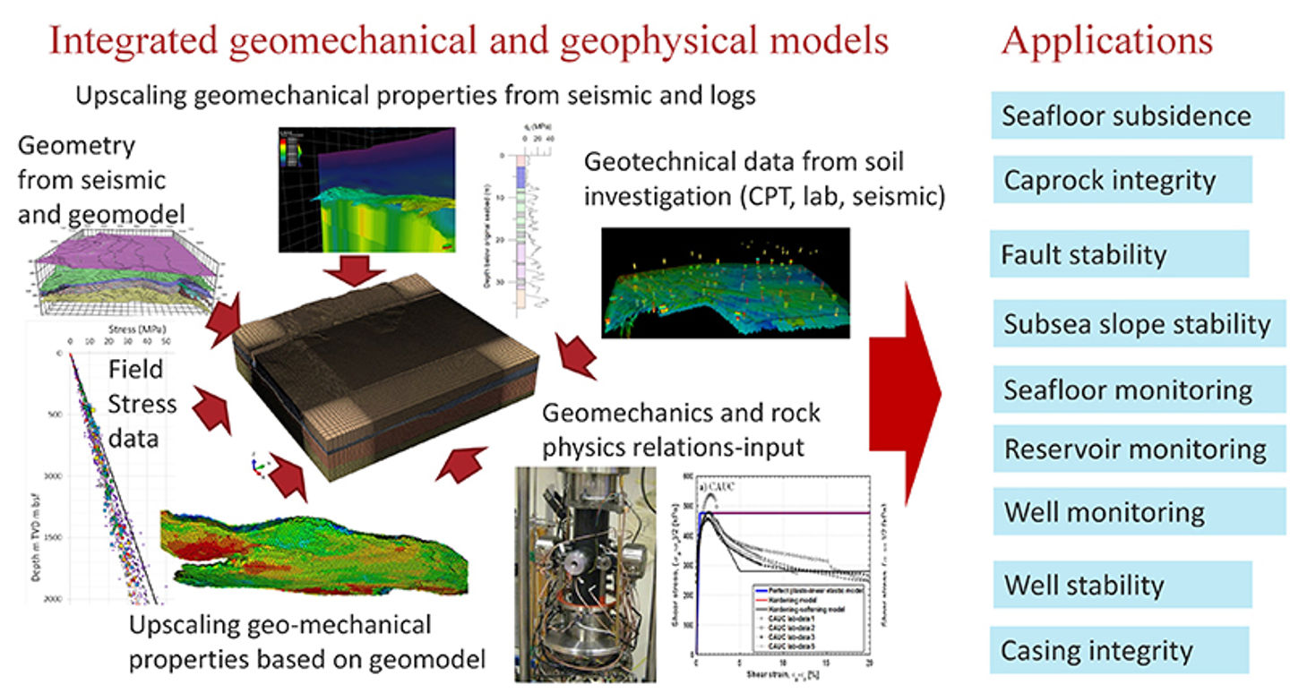 - Overvåking gjennom integrering av geofysikk og geomekanikk: inversjonsmetoder for å estimere reservoarkompaksjon fra målt havbunns innsynkning, dynamiske og statiske parametere fra seismikk for geomekaniske modeller, inkludert bruk av 4D seismikk og spesialkompetanse på skjærbølger.