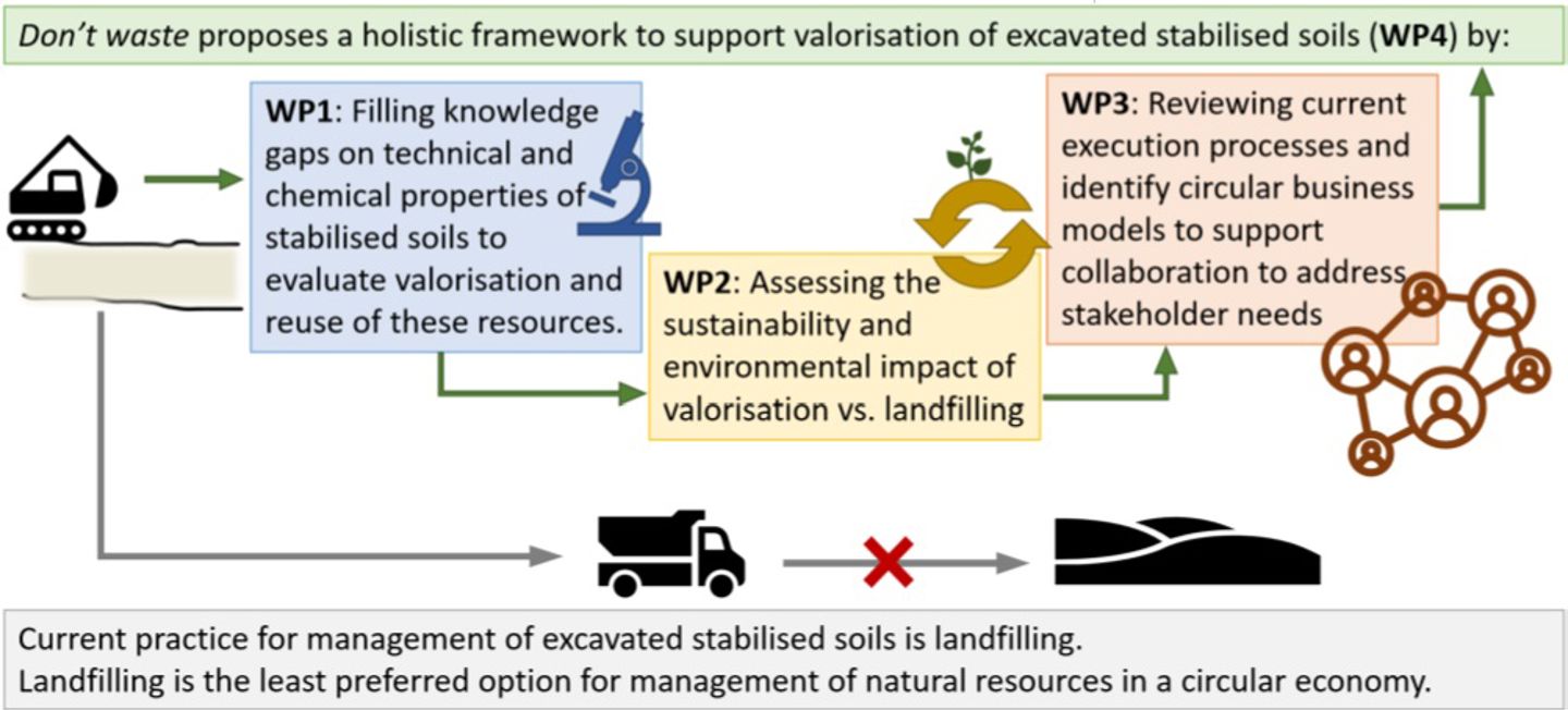 Don't Waste-prosjektet tar for seg miljøutfordringer knyttet til utgraving og deponering av kalk- og sementstabilisert leire. I dag klassifiseres massene som avfall og sendes til deponi eller massetipp, noe som fører til betydelige klimagassutslipp og beslag av arealer. Prosjektet har som mål å utvikle bærekraftige gjenbruksstrategier for disse materialene, i tråd med Norges miljømål og EUs rammedirektiv for avfall. Jernbaneprosjektet Sandbukta-Moss-Såstad, som forventes å produsere store mengder stabilisert leire, vil tjene som en case. Prosjektets mål er å: