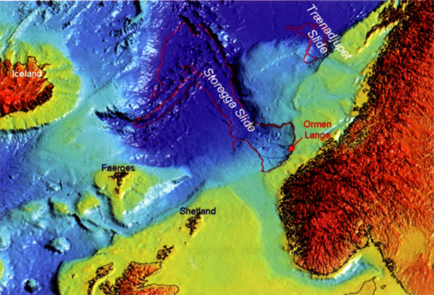 Oversiktskart som viser utbredelsen av Storeggaskredet ut i Norskehavet og plasseringen av Ormen Lange-feltet.